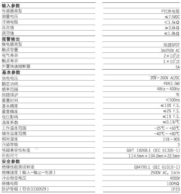 溫度監(jiān)控繼電器 | ETM-PTC | 短路、開路、溫度超限 | PTC熱電阻 | 20~260V AC/DC |