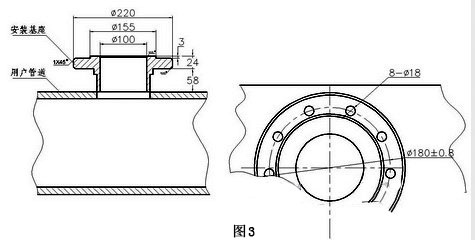 在第一次安裝時(shí),如果被測(cè)管道允許斷流,可按照安裝基座示意圖(圖3),在被測(cè)管道上滿足直管段長(zhǎng)度要求的位置開(kāi)一個(gè)Φ100孔,完成“安裝基座”與管道的連接。然后按照安裝示意圖(圖2)完成全部安裝工作。也可以安裝球閥后暫時(shí)關(guān)閉球閥,以不影響管道輸送流體,待以后再安裝傳感器。