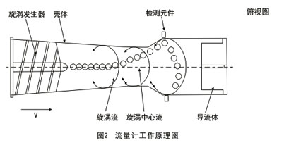 當(dāng)流體通過螺旋形導(dǎo)流葉片組成的旋渦發(fā)生體后,流體被強(qiáng)迫繞旋渦發(fā)生體中心劇烈地旋轉(zhuǎn),形成旋渦流。旋渦流加速,沿流動(dòng)方向經(jīng)縮徑段,流動(dòng)強(qiáng)度增強(qiáng)。當(dāng)旋渦流進(jìn)入擴(kuò)散段后,在導(dǎo)流體回流的作用下,該旋渦產(chǎn)生二次旋轉(zhuǎn)運(yùn)動(dòng),即旋渦進(jìn)動(dòng)。二次旋渦進(jìn)動(dòng)的頻率與流量成正比。當(dāng)流量計(jì)設(shè)計(jì)得當(dāng)時(shí),在很寬的流量范圍內(nèi),旋渦的頻率與流量成線性關(guān)系。該頻率由壓電傳感器檢測,由流量積算儀進(jìn)行運(yùn)算和處理。