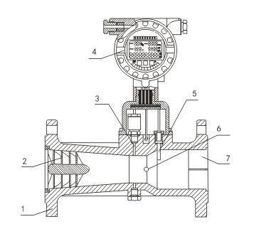 1、殼體 2、旋渦發(fā)生體 3、壓力傳感器 4、流量積算儀 5、溫度傳感器 6、壓電傳感器 7、出口導(dǎo)流體