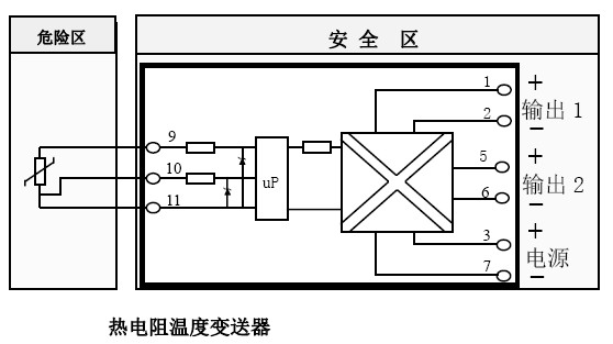 2. 熱電阻溫度變送器通往現(xiàn)場(chǎng)(危險(xiǎn)場(chǎng)所)的軟銅導(dǎo)線截面積必須大于0.5mm2。