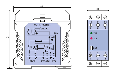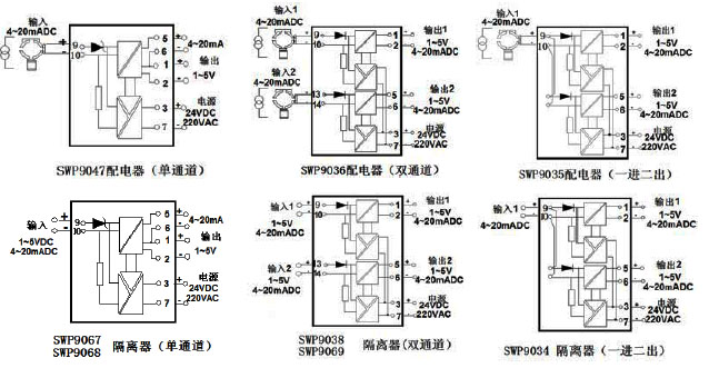 | 配電器(單通道) | SWP-9047 | 4~20mADC | 4~20mADC或1~5VDC | 它向兩線制變送器提供配電電源,并將變送器的信號隔離轉換為輸出 |