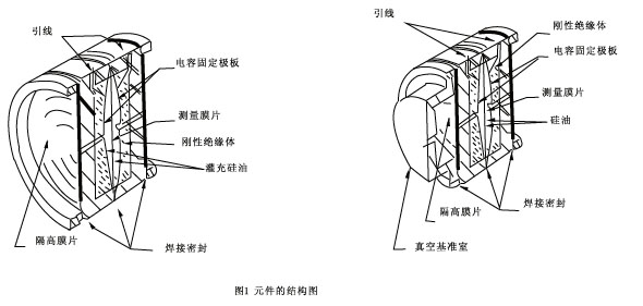被測介質的兩種壓力通入高、低兩壓力室,作用在δ元件(即敏感元件)的兩側隔離膜片上,通過隔膜片和δ元件內(nèi)的填充液傳到預張緊的測量臘片兩側,測量膜片與兩側絕緣體上的電極各組成一個電容器,在無壓力通入或兩壓力均等時測量膜片處于中間位置,兩側兩電容器的電容量相等,當兩側壓力不一致時,致使測量膜片產(chǎn)生位移,其位移量和壓力差成正比,故兩側電容就不等,通過檢測,放大轉換成4-2OmA的二線制電流信號。壓力交送器和絕對壓力交送器的工作原理和差壓變送器相同,所不同的是低壓室壓力是大氣壓或真空元份結構圖見圖1