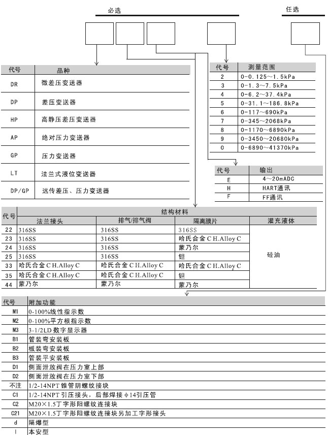 本公司生產(chǎn)的系列電容式變送器品種齊全,用戶可按不同需要任意選用,自微差壓至大差壓,從低壓力至高壓力、絕對壓力、高靜壓差壓。DP/GP型變送器帶上各種遠傳裝置后,就成為遠傳式差壓、壓力變送器。采用ANSI標準,管道尺寸3",法蘭等級150磅(2.5MPa),插入筒式遠傳裝置后,插入筒長度一般為50、100,15Omm用戶可根據(jù)需要選擇其長度。法蘭式掖位交送器一般是整體體工,只要用戶需要也可提供遠傳結構,同樣對遠傳差壓變送器用戶也右選用一側遠傳裝置,毛細管單根長度為1.5、3、4.5、6、7.5m供用戶選擇。接液材料除316L不銹鋼外,還有哈氏C合金,蒙耐爾合金、鉭,可使用于各種腐蝕介質場合。