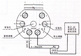變送器的接線原理如圖所示。端子4接24V電源正端、端子3為4~20mA電流輸出端,該端經(jīng)負(fù)載電阻R1后回到24V電源負(fù)端。端子1、2接熱電阻,或2接熱電偶正,1接熱電偶負(fù)。變送器有零點(diǎn)及量程調(diào)節(jié)電位器,便于用戶進(jìn)行微量調(diào)整。