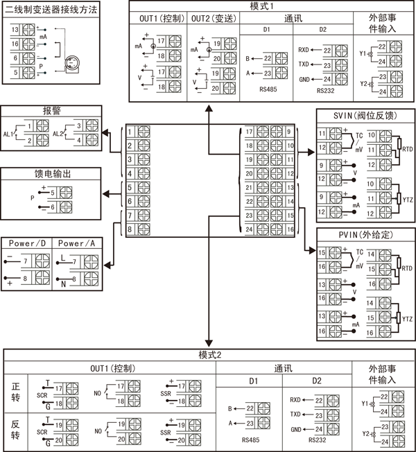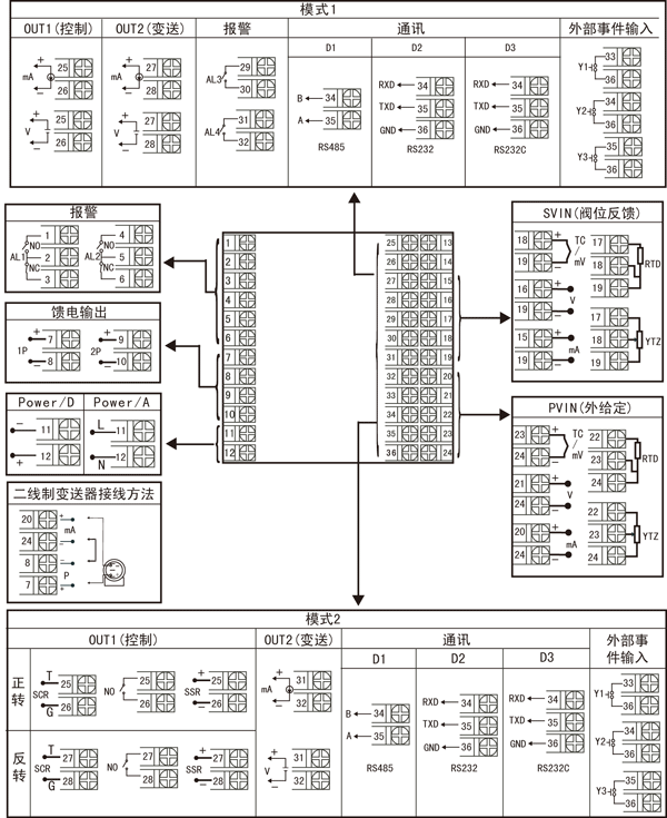 | 注:上述接線圖中在同一組端子標(biāo)有不同功能的,只能選擇其中一種功能。如RS485和RS232在同一組接線端子上,只能選擇一種。 |