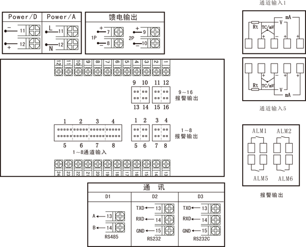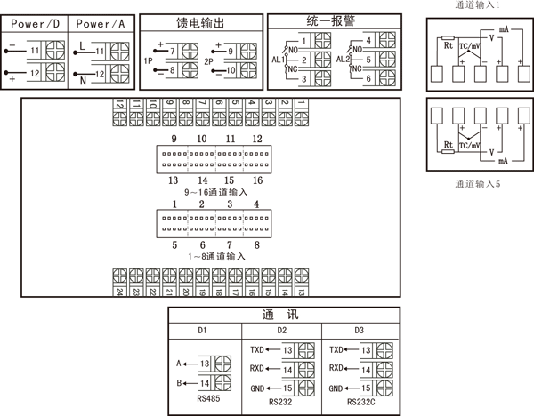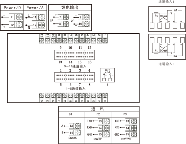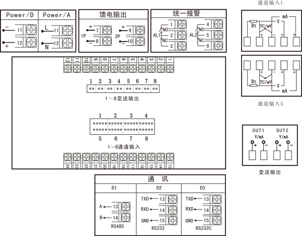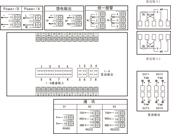 | 注:統(tǒng)一變送輸出的接線端子在1號(hào)輸出端子上。 |