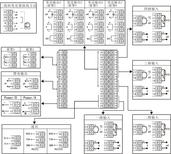 | 1 2 3 4 | 1路變送輸出 2路變送輸出 3路變送輸出 4路變送輸出 | D1 D2 D3 | RS-485通訊接口(Modbus RTU) RS232通訊接口(Modbus RTU) RS232C打印接口 |