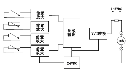 ◆自熱電阻傳感器的測(cè)量信號(hào)通過(guò)前置放大器放大,然后被比較輸入電路(選擇高溫信號(hào))或選點(diǎn)輸入電路選中某一路信號(hào),該信號(hào)通過(guò)電壓/電流(V/I)轉(zhuǎn)換單元將放大器的輸出電壓變?yōu)?-20A恒定電流輸出,原理方框圖如下圖所示: