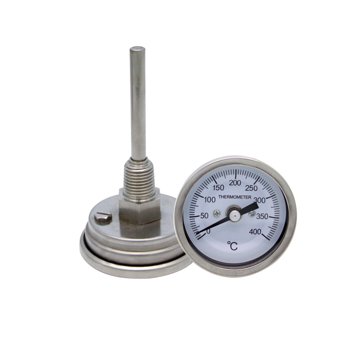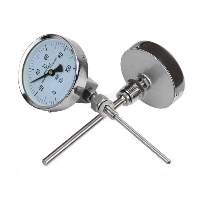 工業(yè)用雙金屬溫度計(jì)主要的元件是一個用兩種或多種金屬片疊壓在一起組成的多層金屬片。為提高測溫靈敏度,通常將金屬片制成螺旋卷形狀。當(dāng)多層金屬片的溫度改變時,各層金屬膨脹或收縮量不等,使得螺旋卷卷起或松開。由于螺旋卷的一端固定而另一端和一可以自由轉(zhuǎn)動的指針相連,因此,當(dāng)雙金屬片感受到溫度變化時,指針即可在一圓形分度標(biāo)尺上指示出溫度來。這種雙金屬溫度計(jì)儀表的測溫范圍是200~650℃,允許誤差均為標(biāo)尺量程的1%左右。
