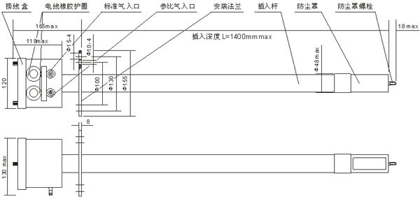 ZO型直插式氧化鋯氧氣含量分析儀一次氧量傳感器采用耐高溫的不繡鋼管,耐腐蝕陶瓷,安裝法蘭,接線盒,防塵罩等材料制成(適用于煙氣溫度≤800℃,二氧化硫SO2