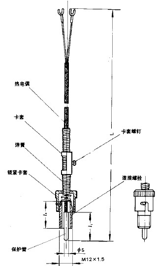 WRET-01型熱電偶的結構如上圖所示,由保護管,安裝螺栓、鎖緊卡套、彈簧及熱電偶導線等組成。