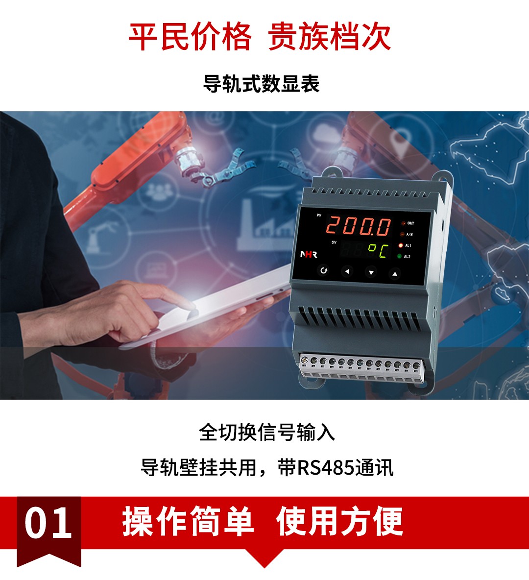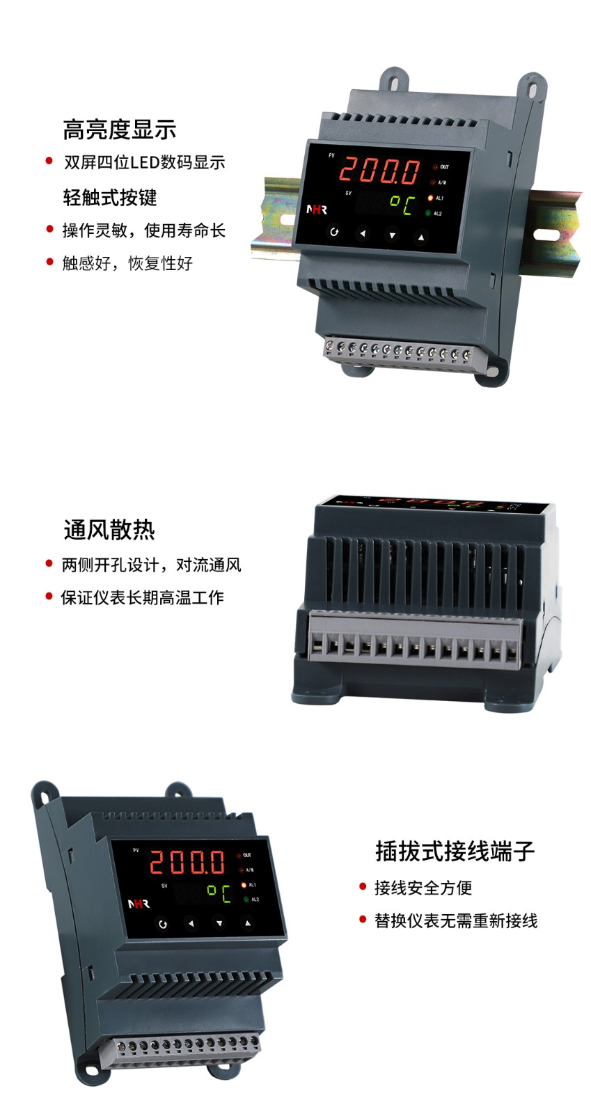 NHR-DN10系列導(dǎo)軌式數(shù)字顯示控制儀采用了表面貼裝工藝,全自動貼片機生產(chǎn),具有很強的抗干擾能力??蓪囟?、壓力、液位等工業(yè)過程參數(shù)進行測量、顯示、報警控制、變送輸出、數(shù)據(jù)采集及通訊。