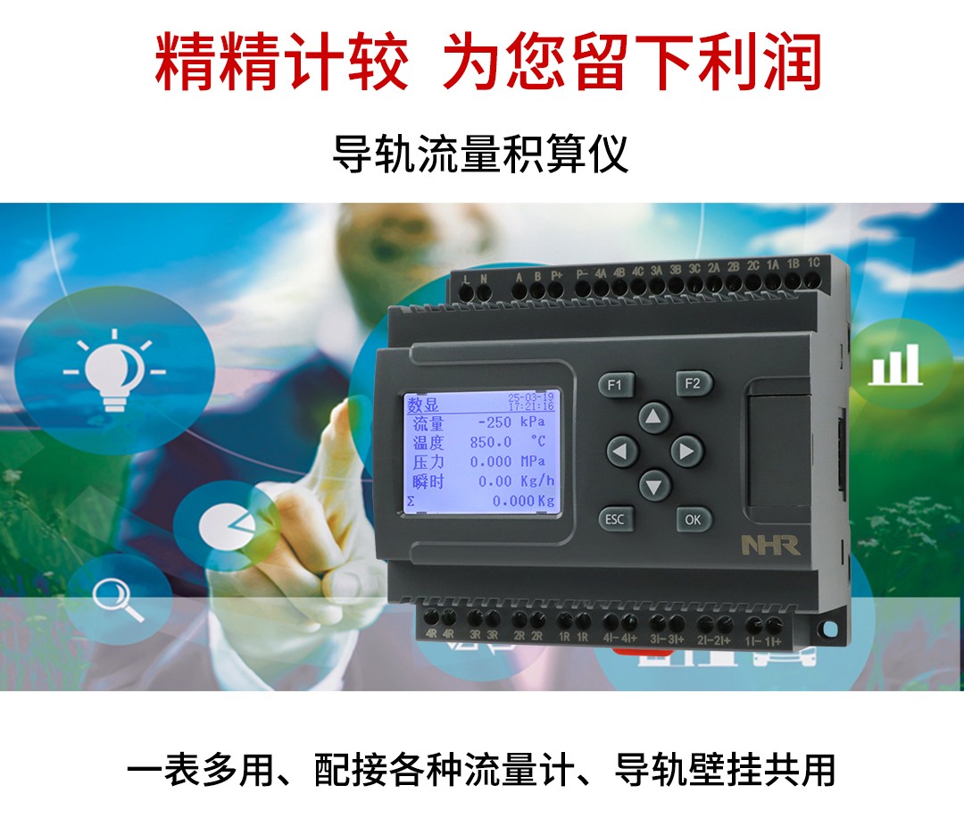 NHR-DN60系列導(dǎo)軌流量積算儀接收來自流量傳感器信號(差壓、脈沖等)、溫度、壓力傳感器的補償信 號實現(xiàn)對氣體、熱水和蒸汽流量進行過程監(jiān)測,總量累積及定量控制。